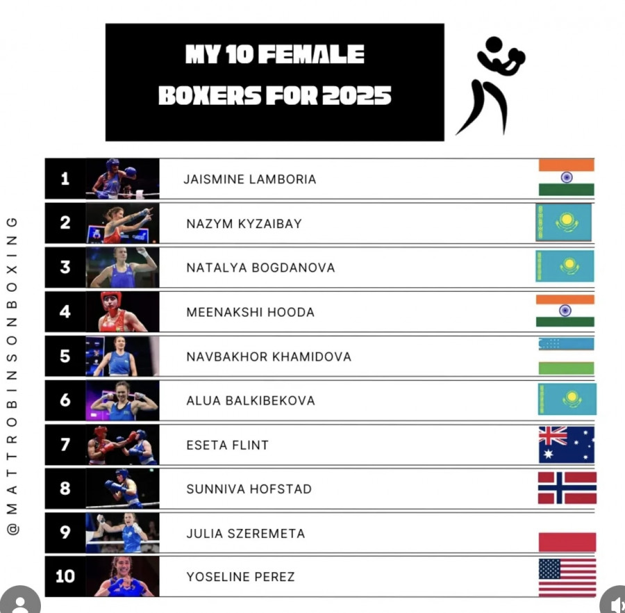 Рейтингтің бірінші орнын Үндістан өкілі Джайсмайн Ламбория иеленсе, екінші сатыға Қазақстанның ең атақты боксшысы Назым Қызайбай көтерілді. Үздік үштікті тағы бір қазақстандық, екі мәрте әлем чемпионы Алуа Балкибекова түйіндеді.