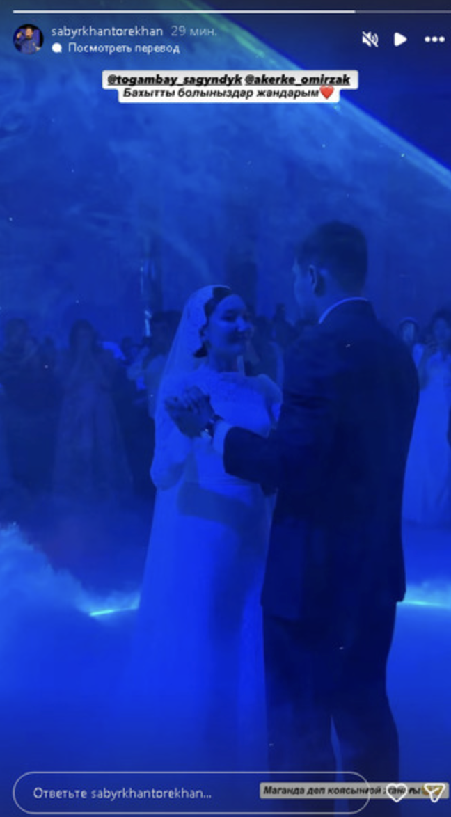 «Құрметті Сағындық Тоғамбай мен Ақерке Өмірзақ, бақытты болыңыздар», — деп жазды Төрехан сторисінде.