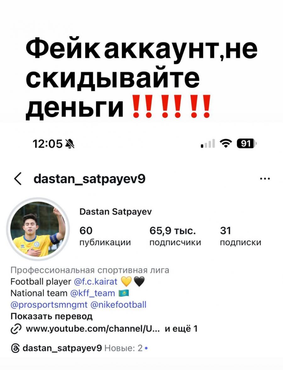Фейк парақша @dastan_satpayev9 деген атпен тіркелген. Онда футболшының суреттері, видеолары мен клубтағы өмірінен алынған жазбалар жарияланған.