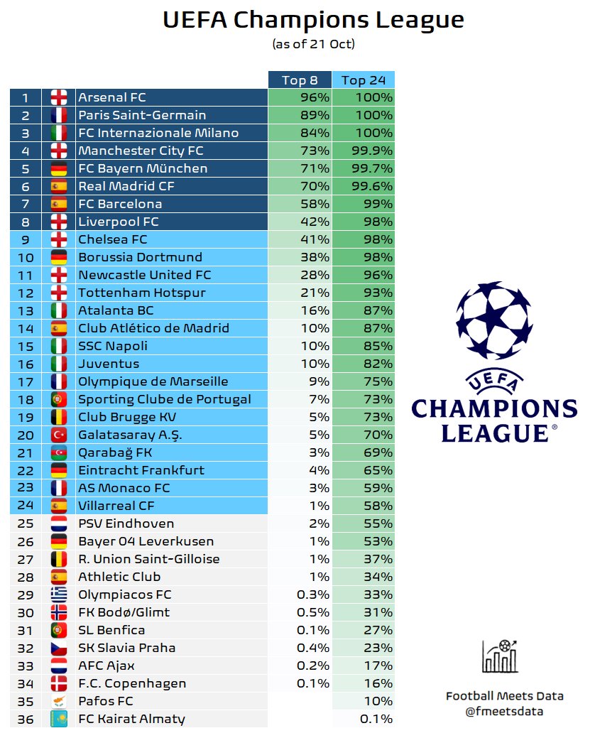 Football Meets Data сайты Чемпиондар лигасының жалпы кезеңіндегі 36 команданың плей-оффқа шығу мүмкіндігін бағалады, деп хабарлайды Sport12.kz