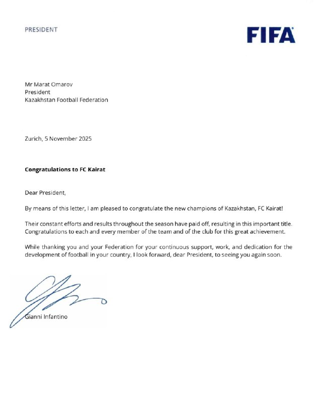 «Осы хат арқылы Қазақстанның жаңа чемпионын — «Қайрат» футбол клубын құттықтауыма рұқсат етіңіз. Маусым бойғы тұрақты еңбектері мен көрсеткен нәтижелері лайықты жемісін беріп, осы маңызды титулға жеткізді. Командадағы әр ойыншыны және клубтың барлық мүшесін осы үлкен жетістікке байланысты құттықтаймын», – деп жазады Инфантино.