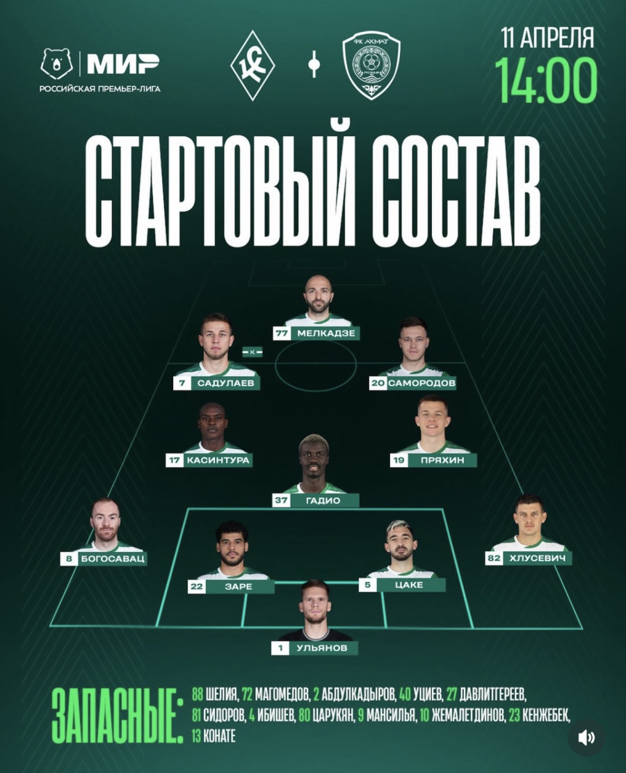 «Ахматтың» бастапқы құрамы: Ульянов, Богосавац, Заре, Цаке, Хлусевич, Гадио, Касинтура, Пряхин, Садулаев, Самородов, Мелкадзе.