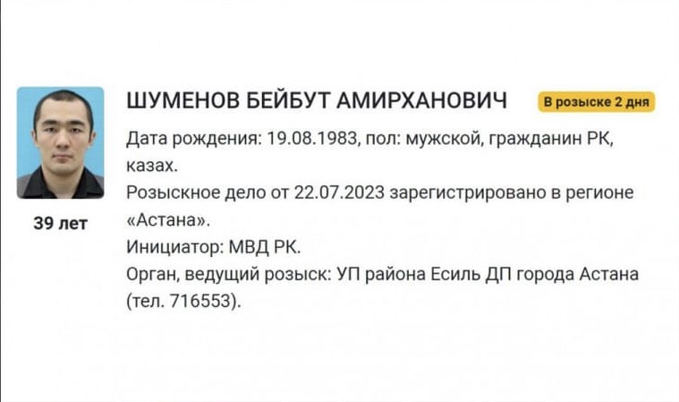 "Шүменов Бейбіт. 2-күн іздестіріліп жатыр. Туған күні: 19.08.1983, жынысы: еркек, Қазақстан Республикасының азаматы, қазақ. Іздестіру ісі 22.07.2023 "Астана өңірде тіркелді". Бастамашы: ҚР ІІМ. Іздестіруді жүргізетін орган: Астана қаласының Есіл аудандық ПБ", - делінген хабарламада.