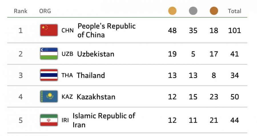 Халықаралық олимпиадалық комитет ережесіне сәйкес, рейтинг алдымен алтын медаль санына қарай есептеледі. Осыған байланысты Қазақстан 13 алтын иеленген Таиландтан аздап қалып отыр, бірақ жалпы жүлде саны бойынша алда.