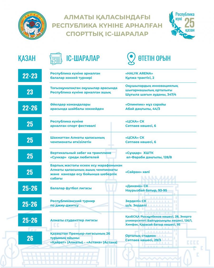Республика күніне орай Алматы қаласында қалалық спорт басқармасының ұйымдастыруымен ауқымды спорттық іс-шаралар өтеді, деп хабарлайды Sport12.kz