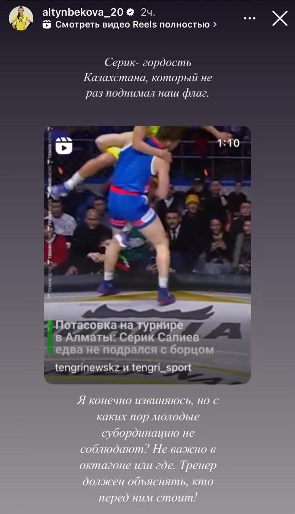 "Серик - гордость Казахстана, который не раз поднимал наш флаг. Я, конечно, извиняюсь, но с каких пор молодые субординацию не соблюдают? Не важно, в октагоне или где. Тренер должен объяснять, кто перед ним стоит", - написала Алтынбекова.